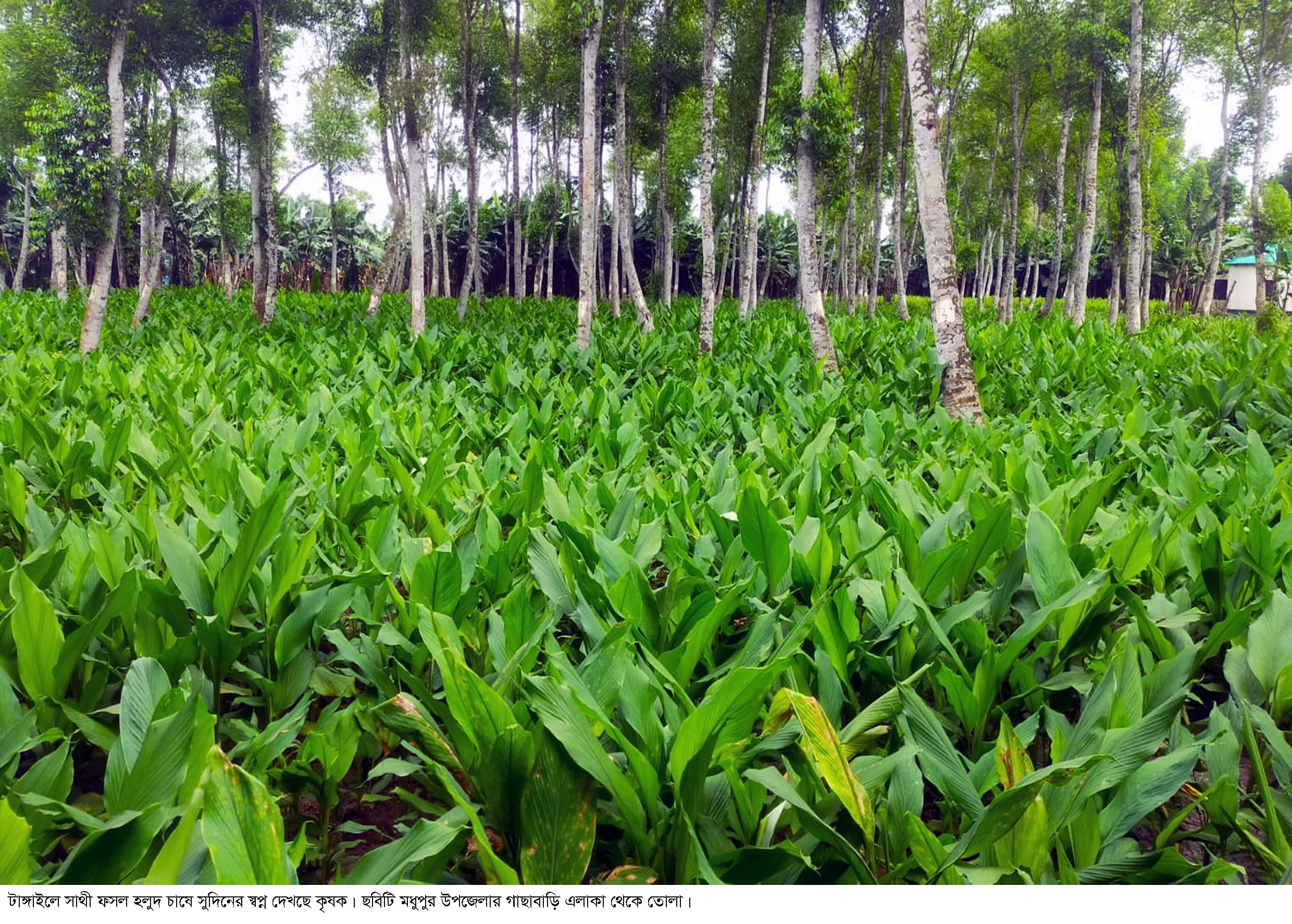 টাঙ্গাইলের ঘাটাইল, মধুপুর ও সখীপুর উপজেলায় মশলা জাতীয় ফসল হলুদের চাষ করে সুদিনের স্বপ্ন দেখছে কৃষকরা। অতিবৃষ্টি ও খরা সহ প্রাকৃতিক বিপর্যয় না ঘটলে হলুদ চাষিরা তৃপ্তির হাসি হাসবেন। হলুদ চাষ অন্য ফসলের চেয়ে অধিক লাভজনক। অল্প জমিতে কম খরচে অধিক হলুদ চাষ করা যায়। পাহাড়ি এলাকায় অন্য ফসলের সঙ্গে সাথী ফসল হিসেবে হলুদের চাষ হয়ে থাকে। হলুদ চাষে নিয়মিত পরিচর্যার দরকার হয়না। এ ফসলে গরু, ছাগল ও পোকা-মাকড়ের কোনো উপদ্রব নেই, ফসল হানির আশঙ্কাও কম। পরিত্যক্ত জমিতে হলুদের চাষ ভালো হয়। বাজারে মশলা জাতীয় পণ্য হলুদের চাহিদা অনেক, দামও অন্য ফসলের চেয়ে ভাল। এ কারণে ঘাটাইল, মধুপুর ও সখীপুর উপজেলার পাহাড়ি এলাকায় হলুদের আবাদ দিন দিন বাড়ছে।