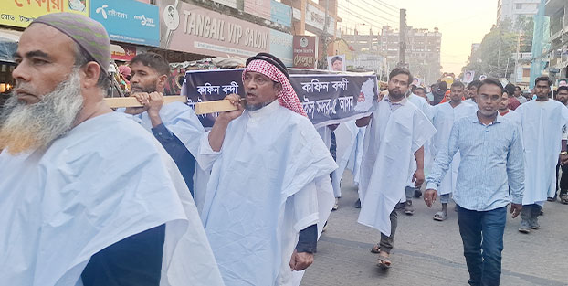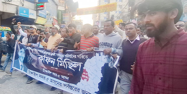 টাঙ্গাইল-৫ (সদর) আসনে বিএনপি প্রার্থী সুলতান সালাউদ্দিন টুকুর মনোনয়ন বাতিলের দাবিতে কাফনের কাপড় পরে কফিন মিছিল করা হয়েছে।