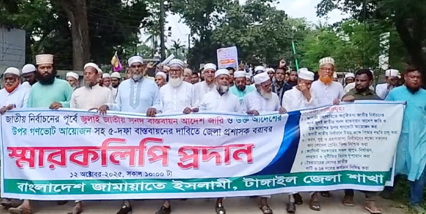 রোববার (১২ অক্টোবার) সকালে মিছিল সহকারে জামায়াতে ইসলামীর নেতা-কর্মীরা জেলা প্রশাসকের কার্যালয়ে গেয়ে পৌছান। পরে টাঙ্গাইল-৫ (সদর) আসনে বাংলাদেশ জামায়াতে ইসলামী মনোনীত এমপি প্রার্থী ও জেলা আমীর আহসান হাবিব মাসুদসহ অন্যান্য নেতৃবৃন্দ স্মারকলিপি হস্তান্তর করেন। স্মারকলিপি গ্রহন করেন জেলা প্রশাসক শরীফা হক।