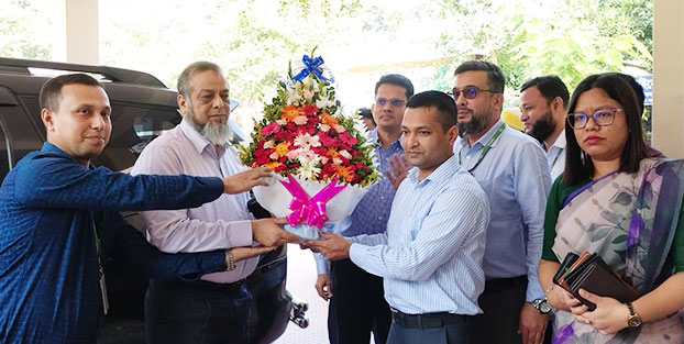 প্রধান অতিথিকে ফুল দিয়ে বরণ করে নিচ্ছেন টাঙ্গাইল বিআরটিএ এর কর্মকর্তাবৃন্দ